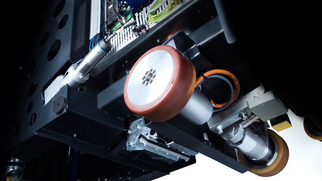 AGV システムは、企業において物資の搬送に使用されます。AGV は自ら進路を選ぶことができ、障害物を避け、前後はもちろん左右にも移動できます。車両の総重量は、約300 kgから25tです。この革新的な AGV は電気駆動装置によって動作します。